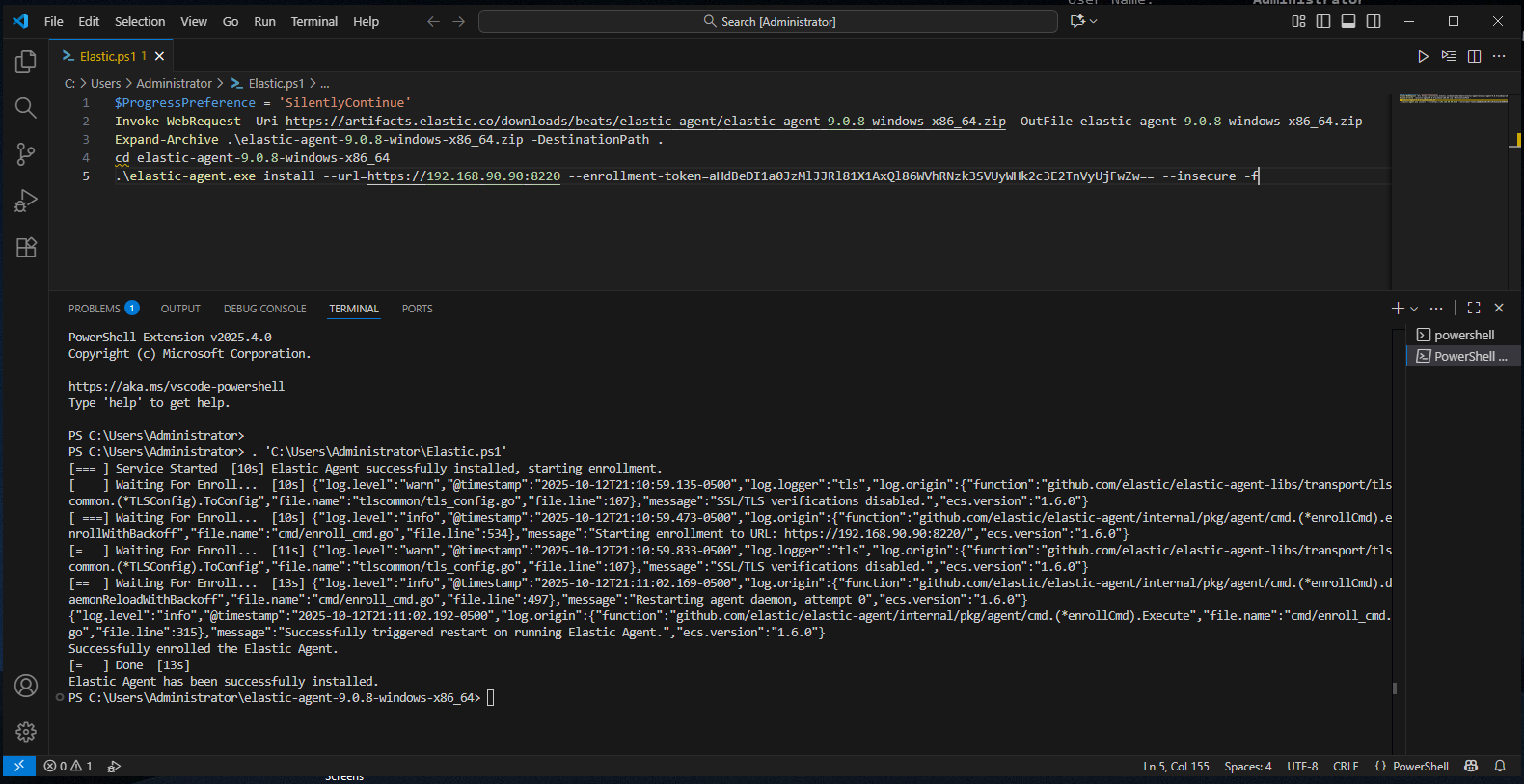 $ProgressPreference = 'SilentlyContinue' Invoke-WebRequest -Uri https://artifacts.elastic.co/downloads/beats/elastic-agent/elastic-agent-9.0.8-windows-x86_64.zip -OutFile elastic-agent-9.0.8-windows-x86_64.zip Expand-Archive .\elastic-agent-9.0.8-windows-x86_64.zip -DestinationPath . cd elastic-agent-9.0.8-windows-x86_64 .\elastic-agent.exe install --url=https://192.168.90.90:8220 --enrollment-token=NGkwNzFwa0JWcG5sYUtIZlBHQTk6NHdfNDRMaVZudDhMZUVnZnFnc25CUQ==