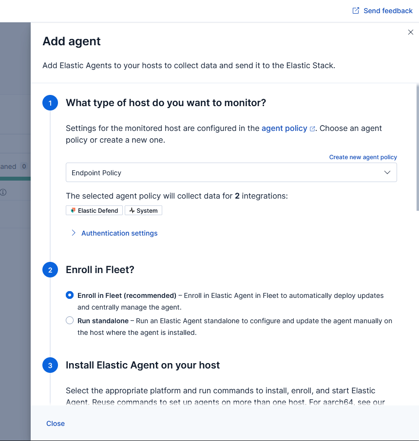 The final component is the Elastic Agent, which needs to be installed on the endpoints to report data back to the Elastic Container Project server: