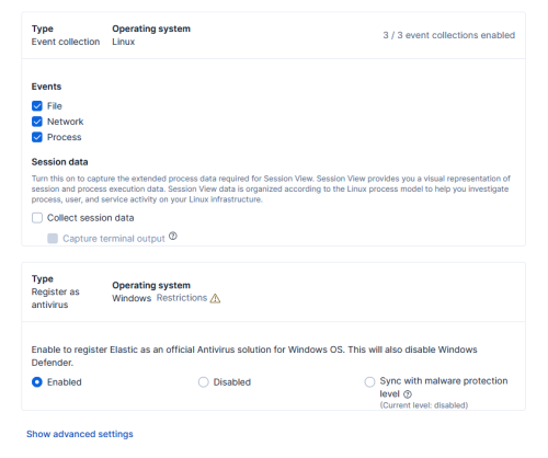 While still on the Elastic Defend page, scroll down to the bottom, under Register as antivirus, select Enabled, and then Save Integration: