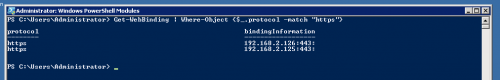 PS C:\Users\Administrator> Get-WebBinding | Where-Object {$_.protocol -match “https”}