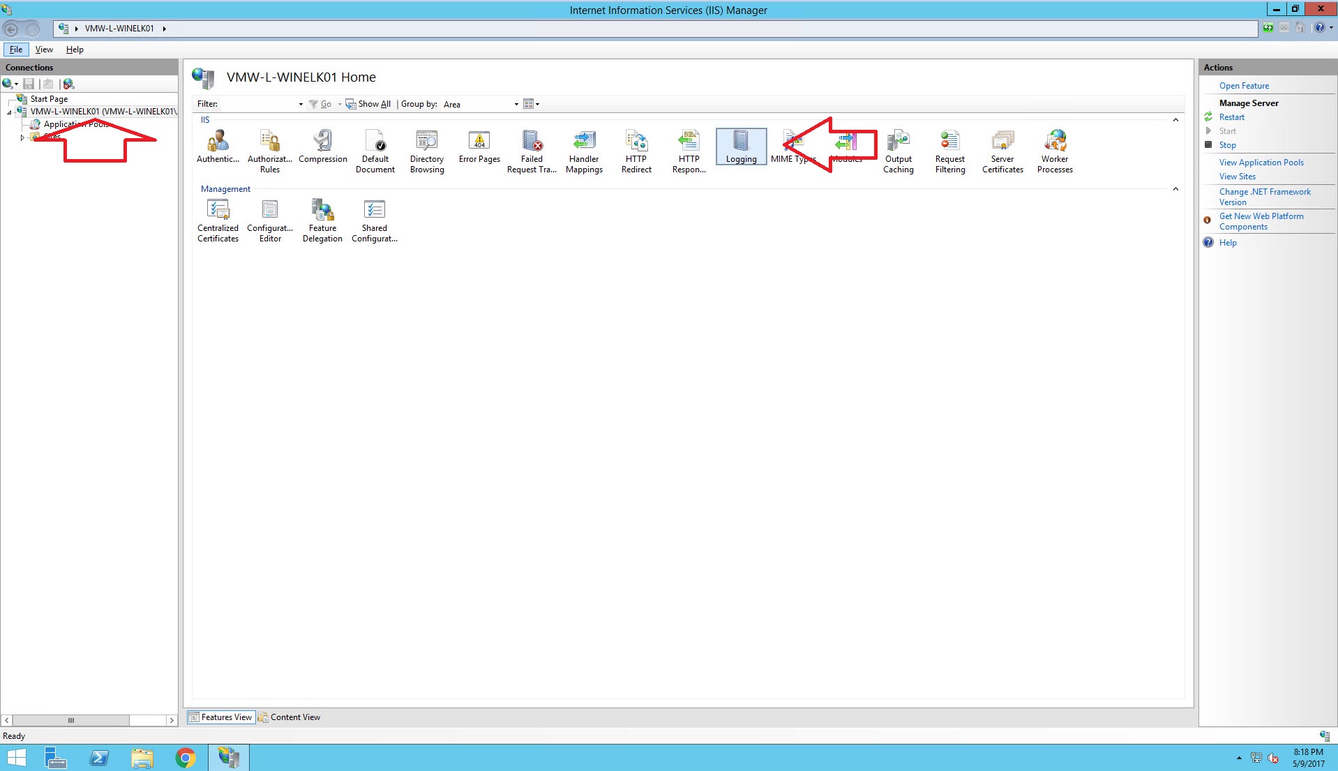 1.) Open IIS Manager, click on the server level on the left hand side and then click on Logging in the center pane.
