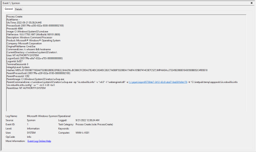 There is a lot of useful information here – Notice the image (c:\windows\system32\cmd.exe), command line (cmd.exe /c whoami && hostname) and that the parent process is the IIS worker process (w3wp.exe) running under the IIS application pool identity (IIS APPPOOL\iis.robwillis.info).