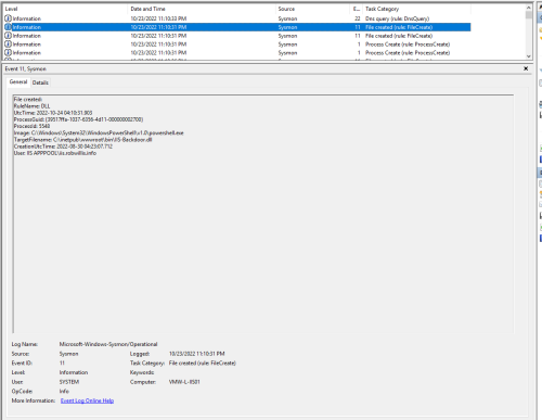 | Sysmon/Operational | 1 (Process Create) & 11 (File Created) | Captured the download of IIS-Backdoor.dll from the remote domain to the local IIS directory using PowerShell via the web shell/w3wp.exe |
