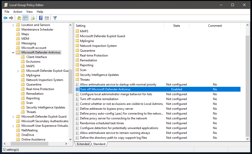 Computer Configuration > Administrative Templates > Windows Components > Microsoft Defender Antivirus – “Turn off Microsoft Defender Antivirus”